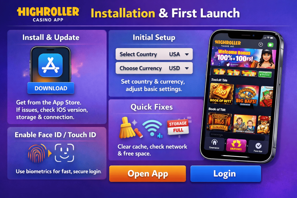 The Highroller Casino iOS app can be installed directly from the official App Store. Installation usually takes less than a minute on a stable internet connection. If the app does not install or update correctly, check your iOS version, available storage space, and network connection. Restarting the device or updating iOS often resolves most installation issues.